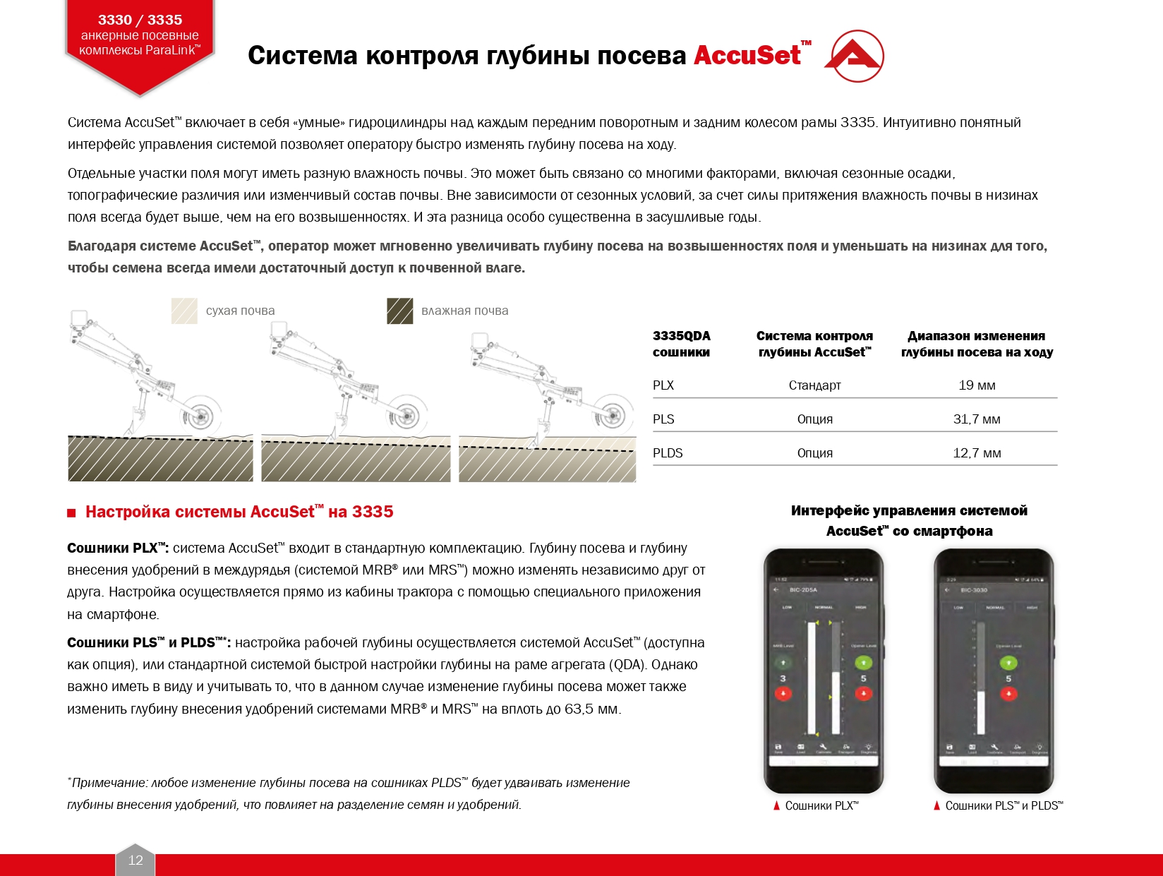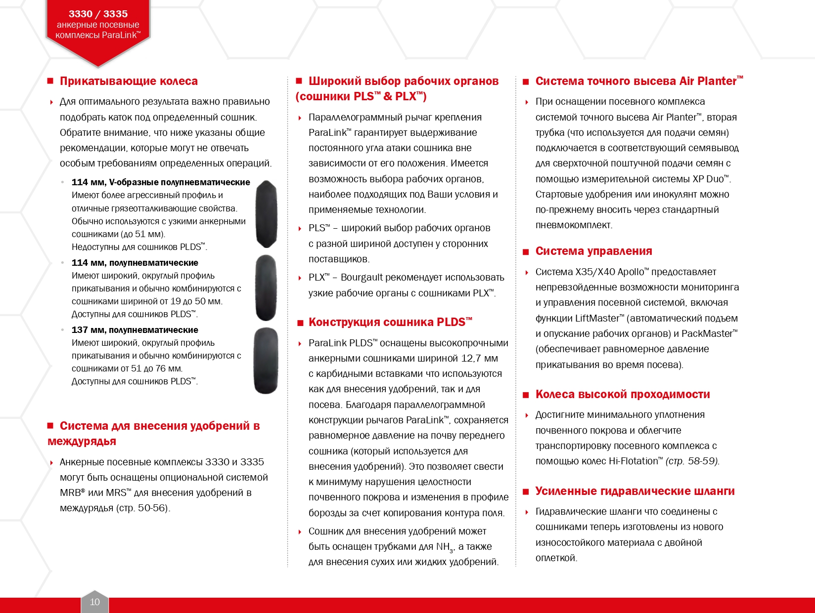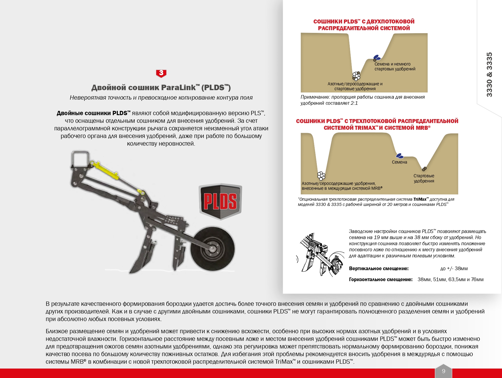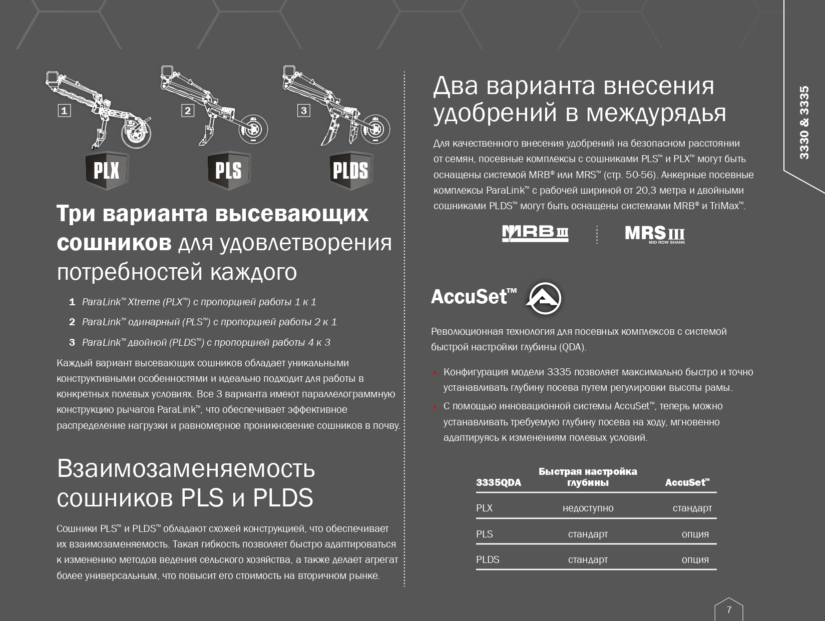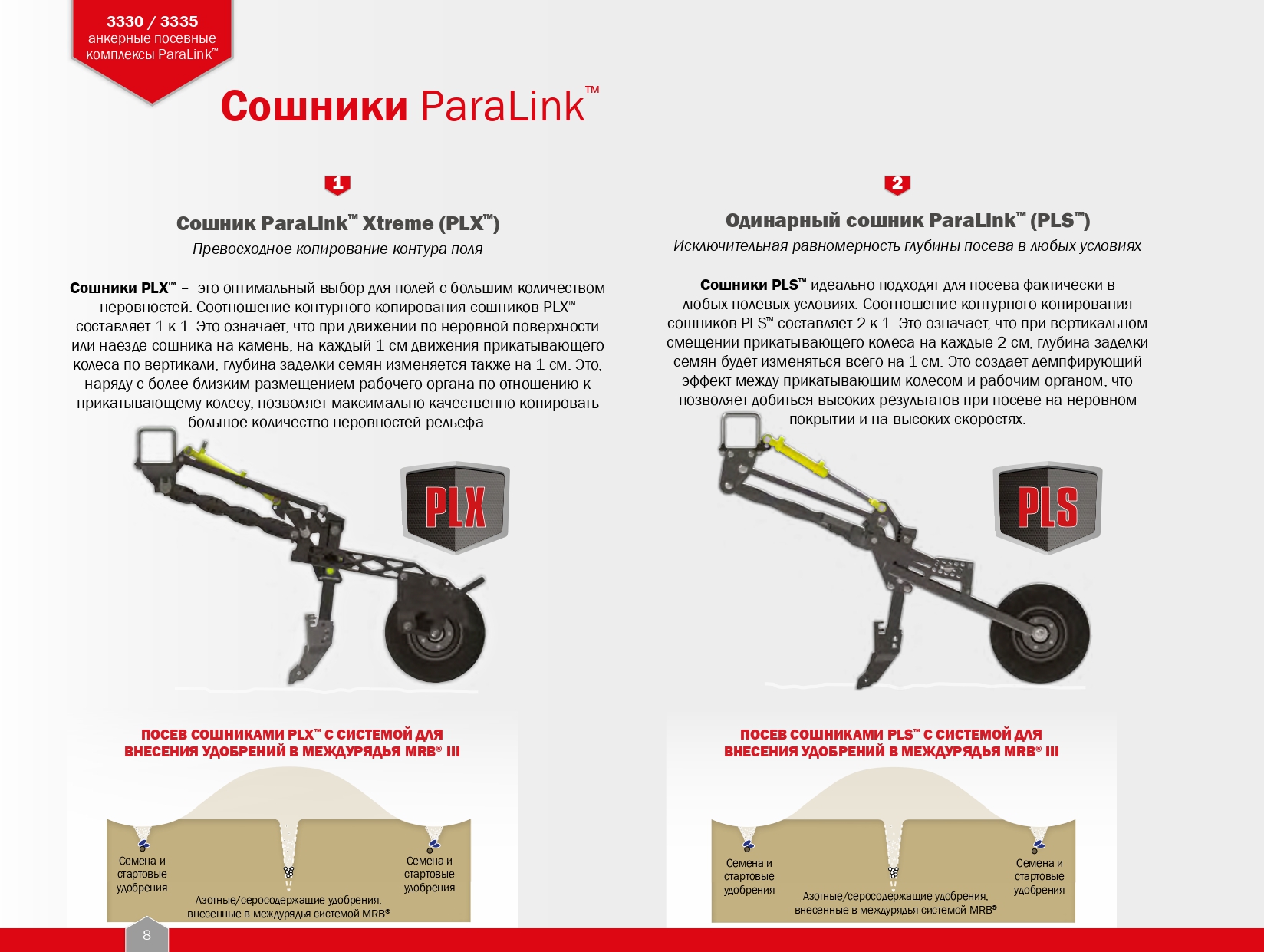 Каждая конфигурация сошников обладает уникальными конструктивными особенностями и идеально подходит для работы в конкретных полевых условиях. Все сошники имеют параллелограммную конструкцию рычагов ParaLink™, что обеспечивает эффективное распределение нагрузки и равномерное проникновение сошников в почву.