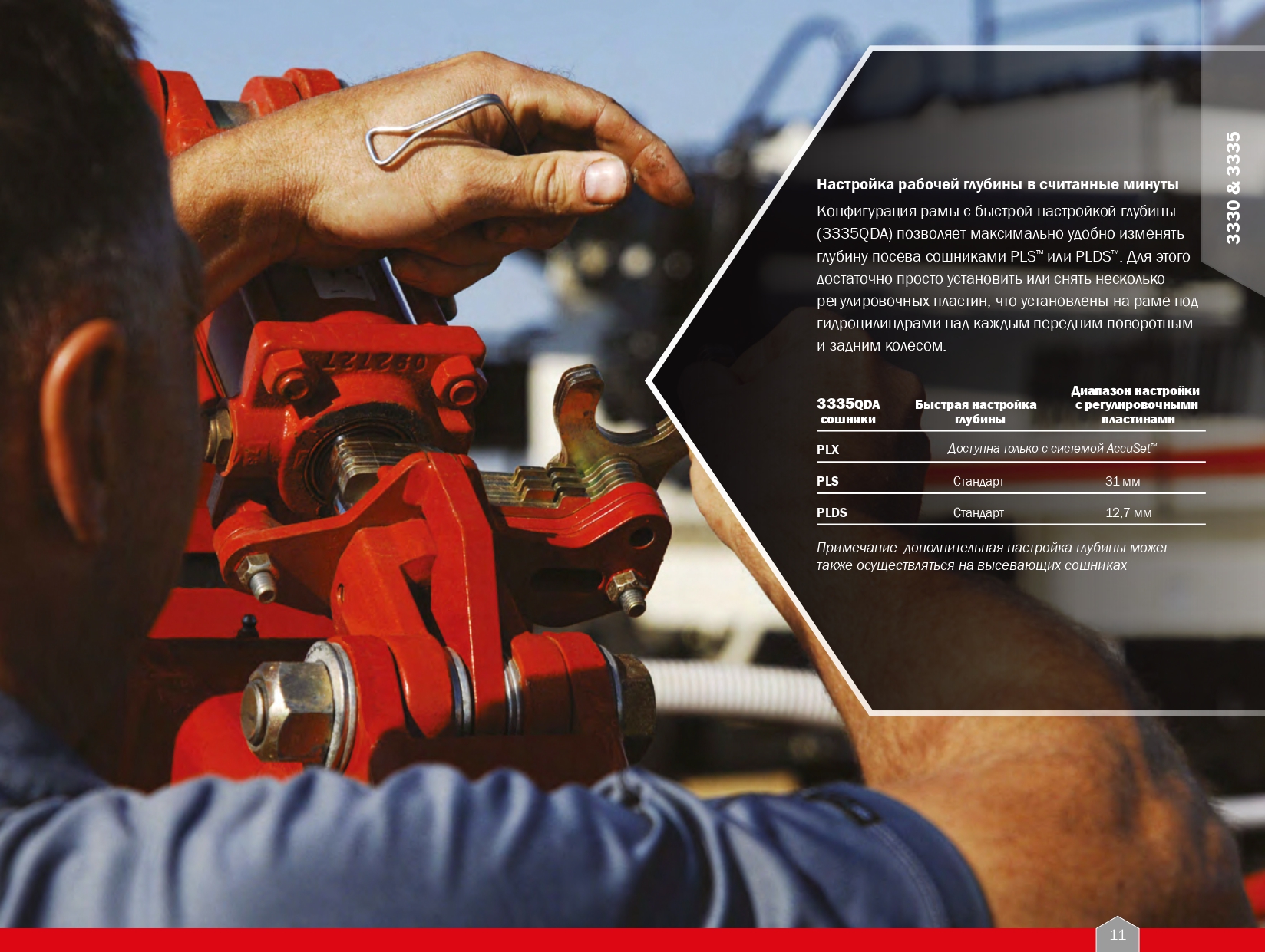 Посевные комплексы модели 3335 оснащены системой быстрой настройки глубины на раме агрегата. Сжатые временные рамки часто вынуждают операторов выбирать «близкое» значение глубины, которое просто является усредненным. А установка правильной рабочей глубины для определенной культуры и конкретных условий чрезвычайно важна для достижения оптимальных и равномерных всходов.