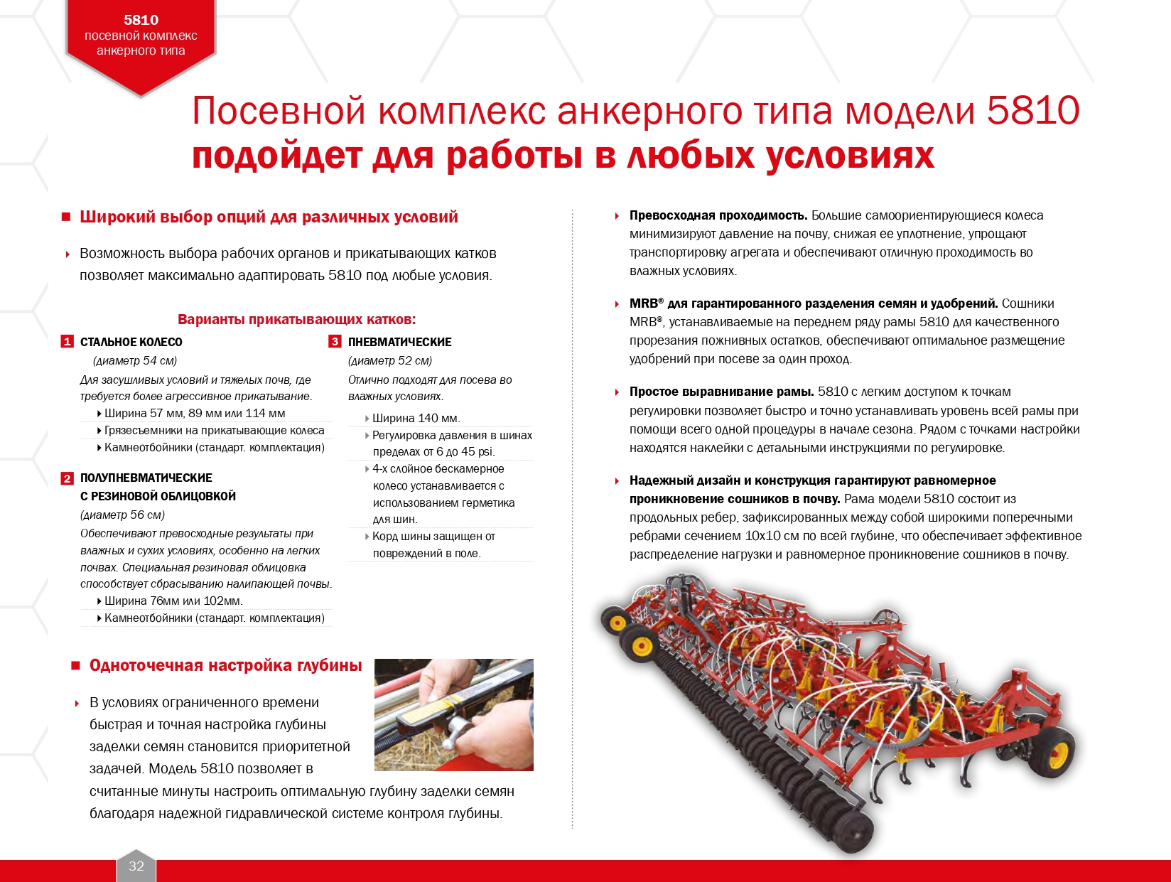 Высококачественная система контроля глубины с надежными гидравлическими компонентами гарантирует точный контроль глубины заделки и длительный срок службы.